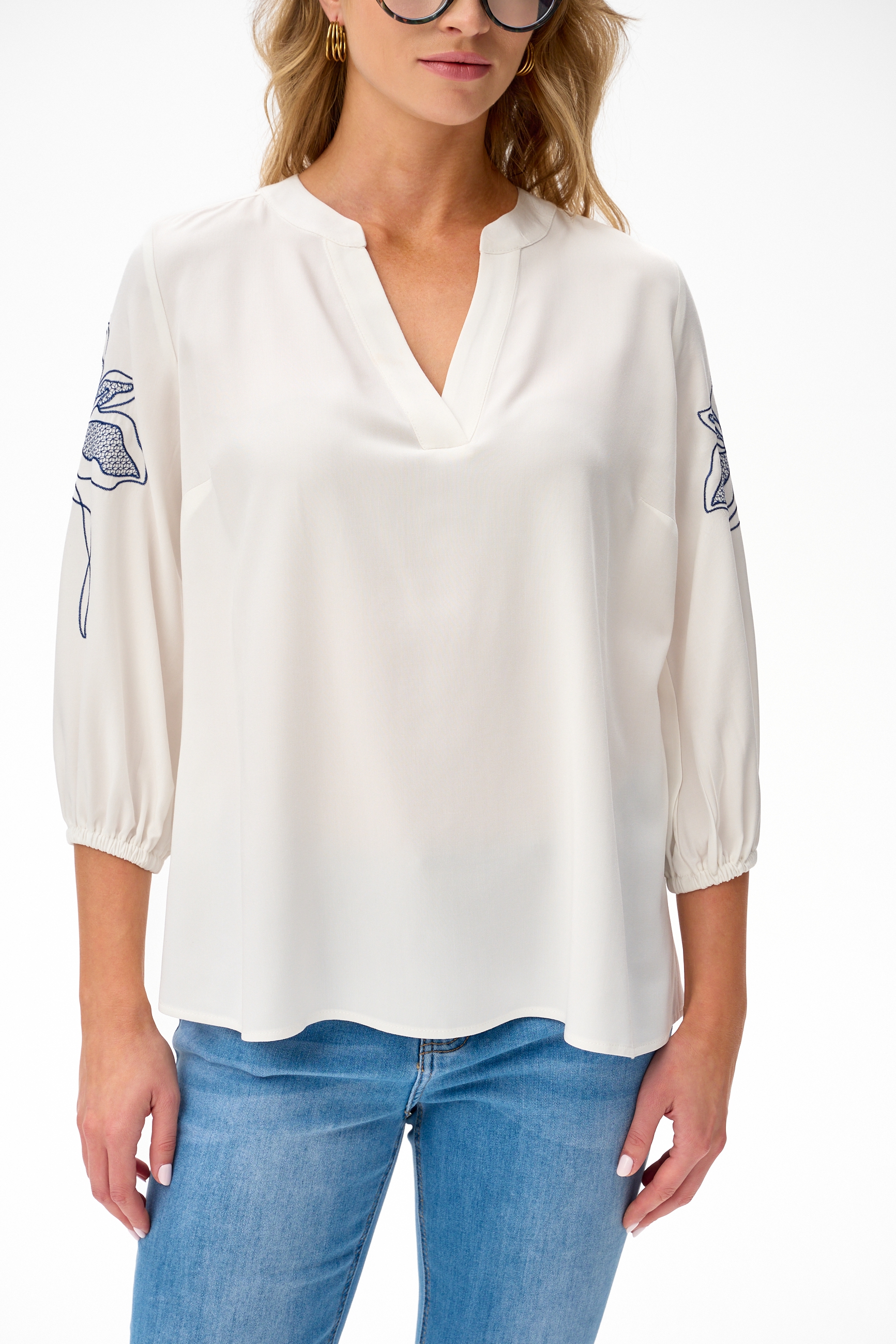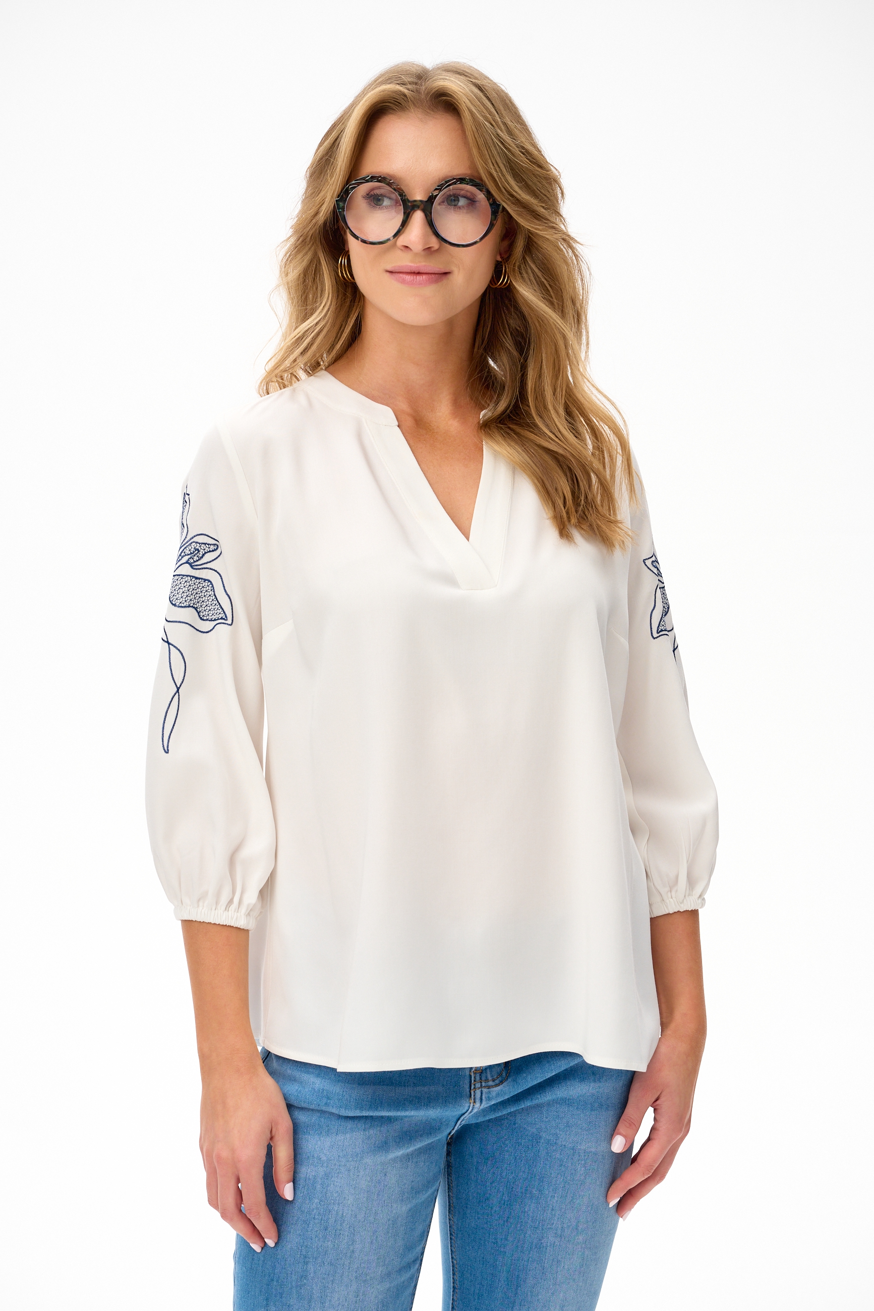Czy bluzka może być obszerna i spadająca z sylwetki, ale zarazem bardzo elegancka i kobieca? Czy ozdobny, jednokolorowy haft na ramieniu i kolorowy haft imitujący koronkę wypełnieniem płatków, umiejscowiony niżej na rękawach, to dobre połączenie? Czy możliwe jest takie rozwiązanie dekoltu, aby miał jednocześnie serek oraz stójkę? Czy matowy modal może być aż tak zwiewny? I czy taki projekt w ogóle istnieje? Na wszystkie te pytania odpowiadamy “tak”