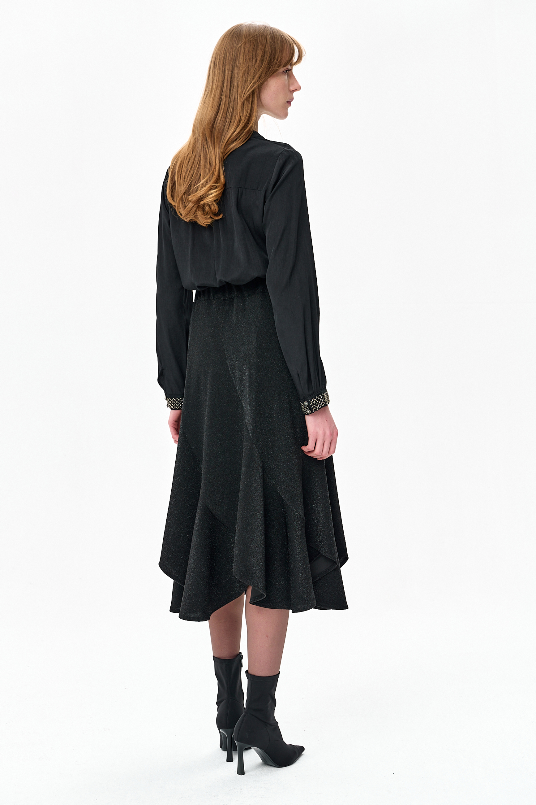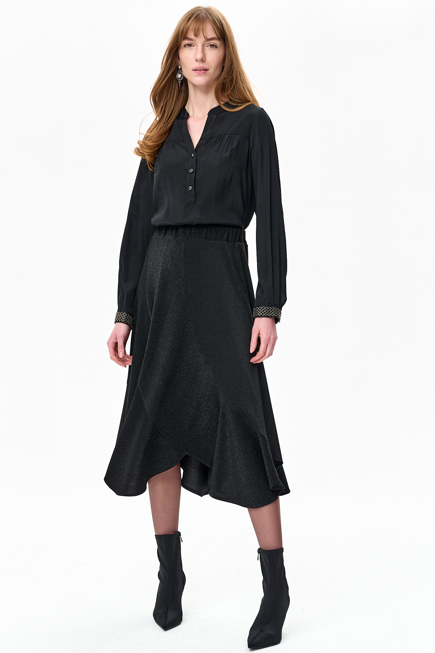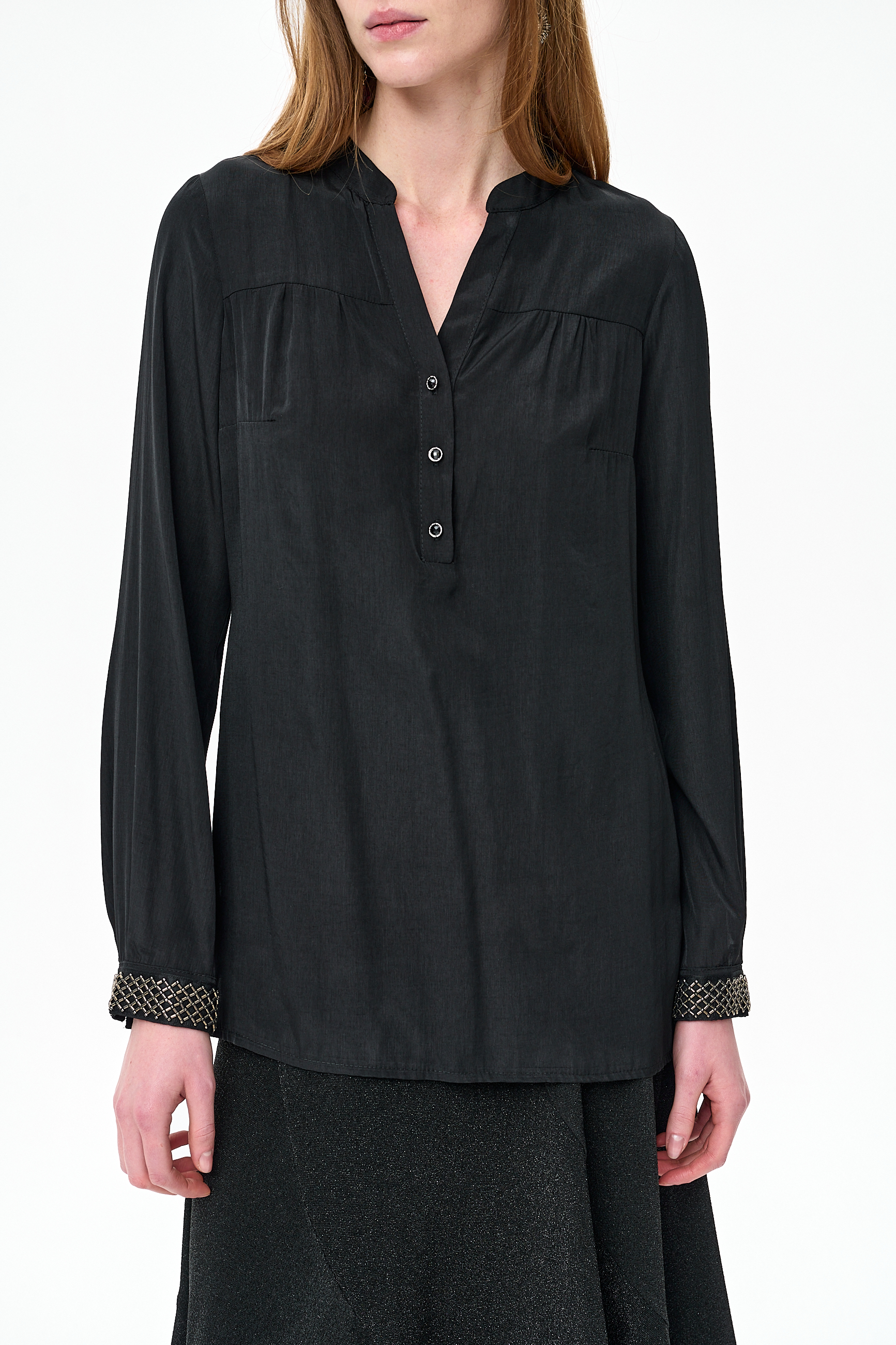 XX to czarna bluzka na stójce. Ma odcinany karczek, a od biustu w dół robi się luźniejsza. Dzięki temu, między innymi, zakrywa niedoskonałości urody, spowodowane okresem świętowania z rodziną i przyjaciółmi. I nie byłoby w niej nic oryginalnego, gdyby nie te nietuzinkowe dodatki. Po pierwsze – zapinana jest na ozdobne guziki. A w mankietach ma boskie, biżuteryjne elementy, wykonane z haftowanej koralikami taśmy w kolorze czarnego niklu. No czyż nie wygląda to jakbyś miała na sobie elegancką bransoletkę na każdej ręce?
