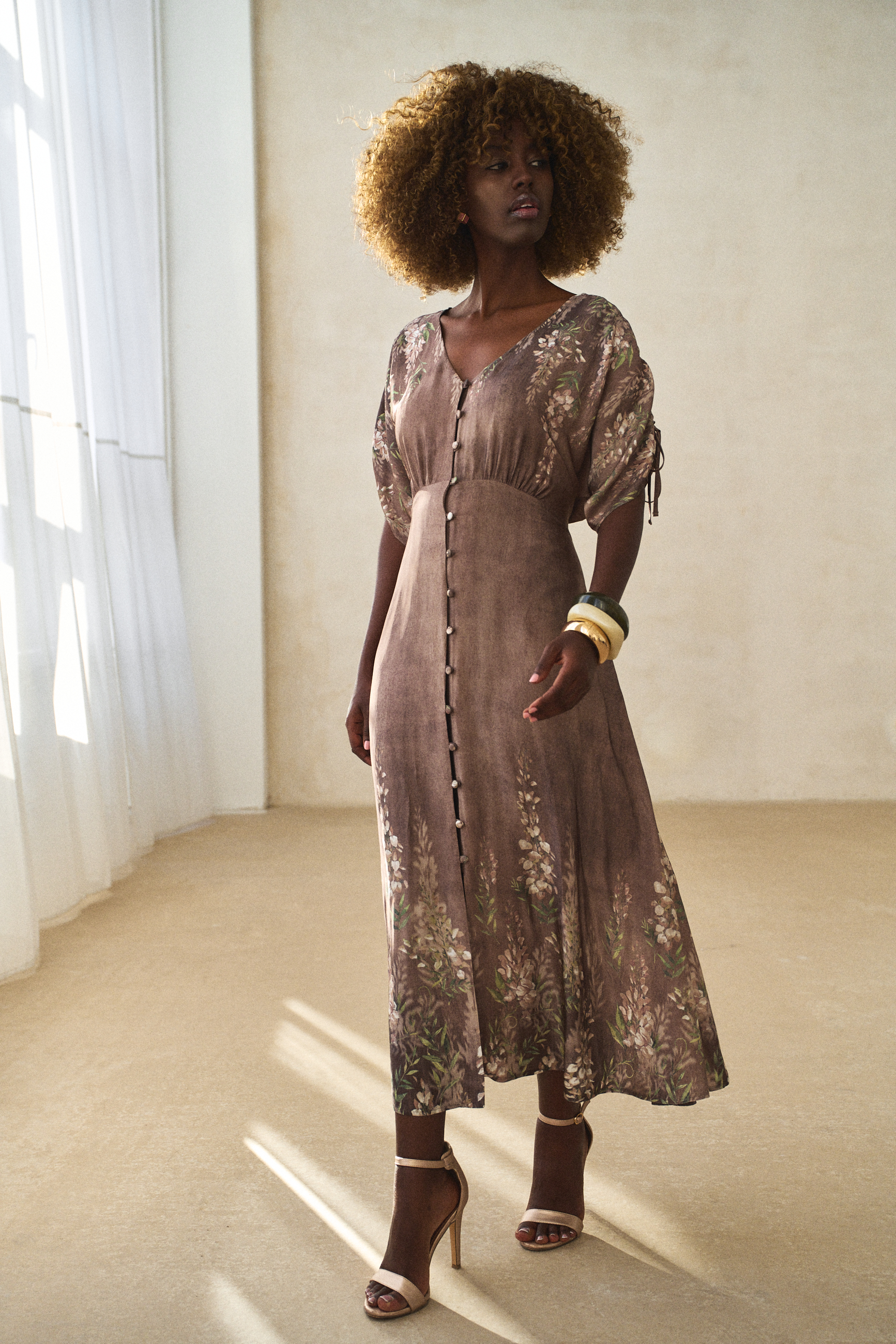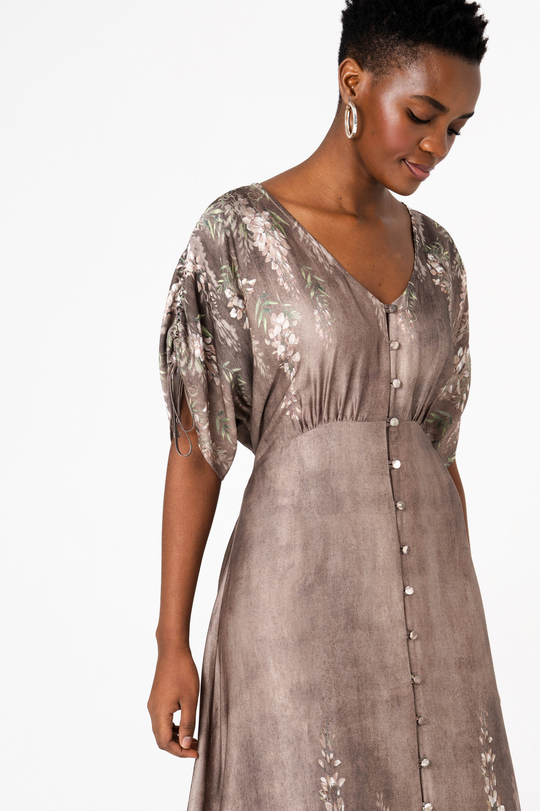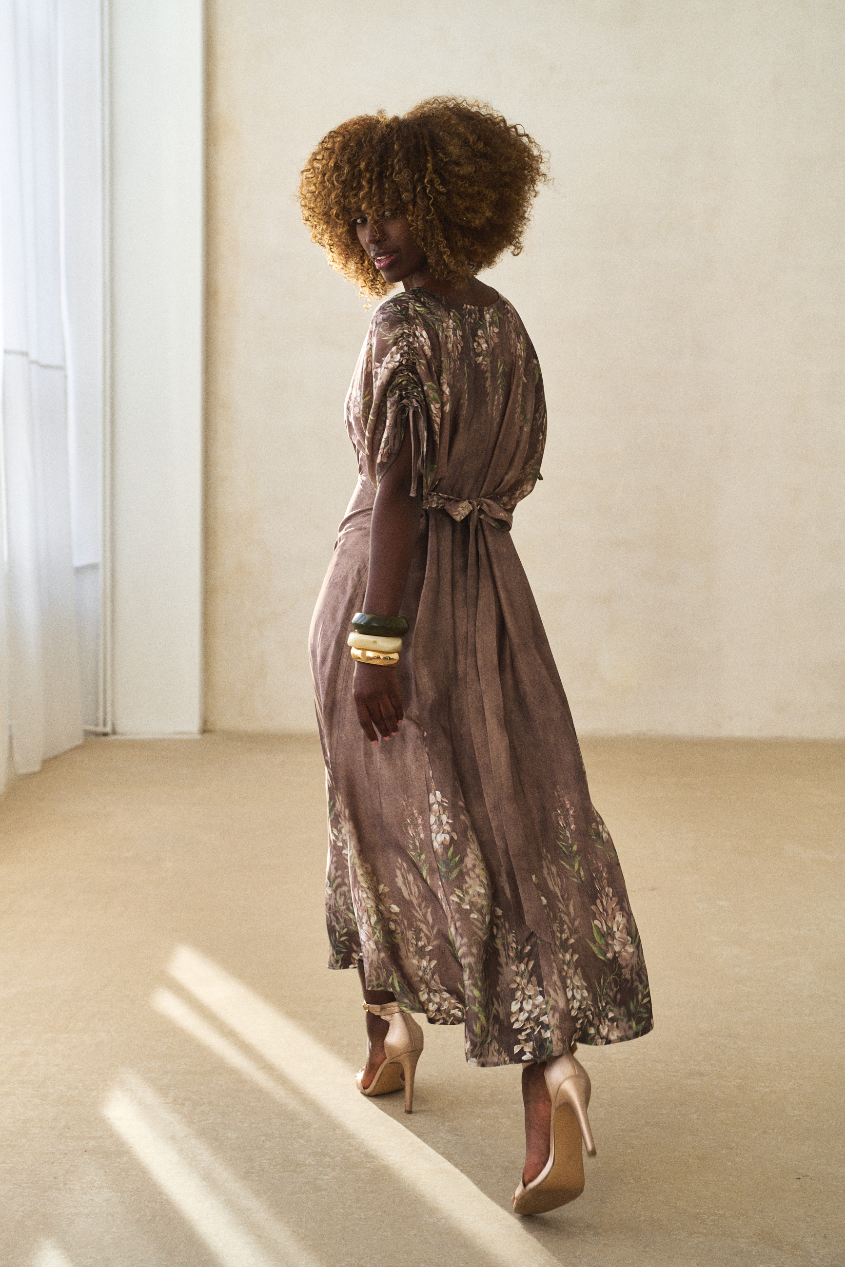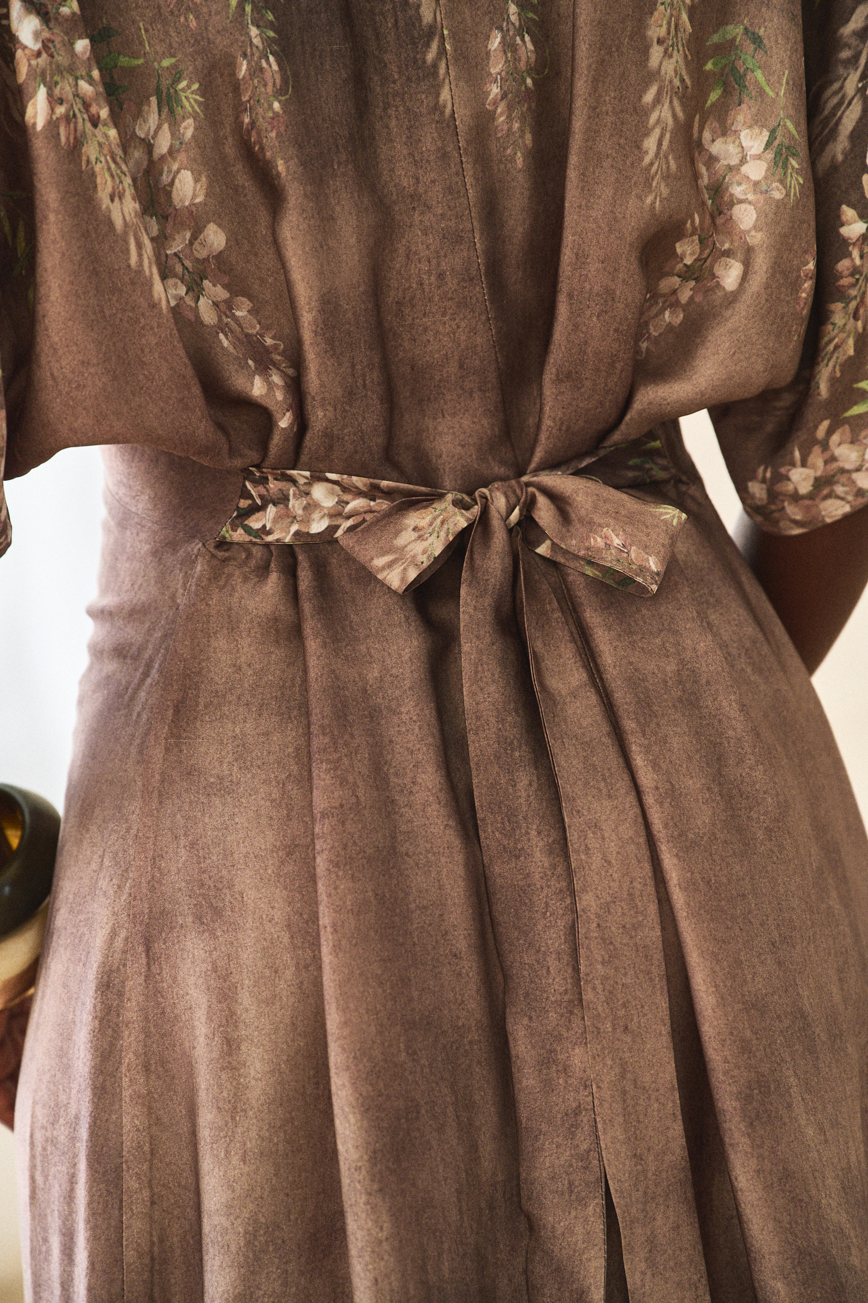 Sukienki zazwyczaj projektuje się, kroi i szyje. Ale ten model długości midi wygląda, jakby był namalowany, prawda? A to wszystko dzięki temu plastycznemu, deseniowi w kwiaty, którego nierównomierne tło przypomina impresjonistyczny obraz. Aby uzyskać taki efekt, tkanina musi być krojona ręcznie. A do wrażenia przestrzenności przyczynia się dodatkowo sama tkanina – zwiewna, powłóczysta wiskoza. Sukienka skrywa też inne artystyczne detale. Z góry do dołu zapina się na guziki z tkaniny zasadniczej. A to oznacza, że GABI może spełniać także rolę narzutki. Dla podkreślenia talii sugerujemy związać ją z tyłu. W wierzchu rękawa natomiast wszyte są ozdobne tasiemki, którymi można marszczyć rękawy. Jedyną rzeczą, na którą nie możemy się zdecydować, jest nazwa na ten oryginalny styl, łączący modę z malarstwem. Masz może jakieś propozycje?