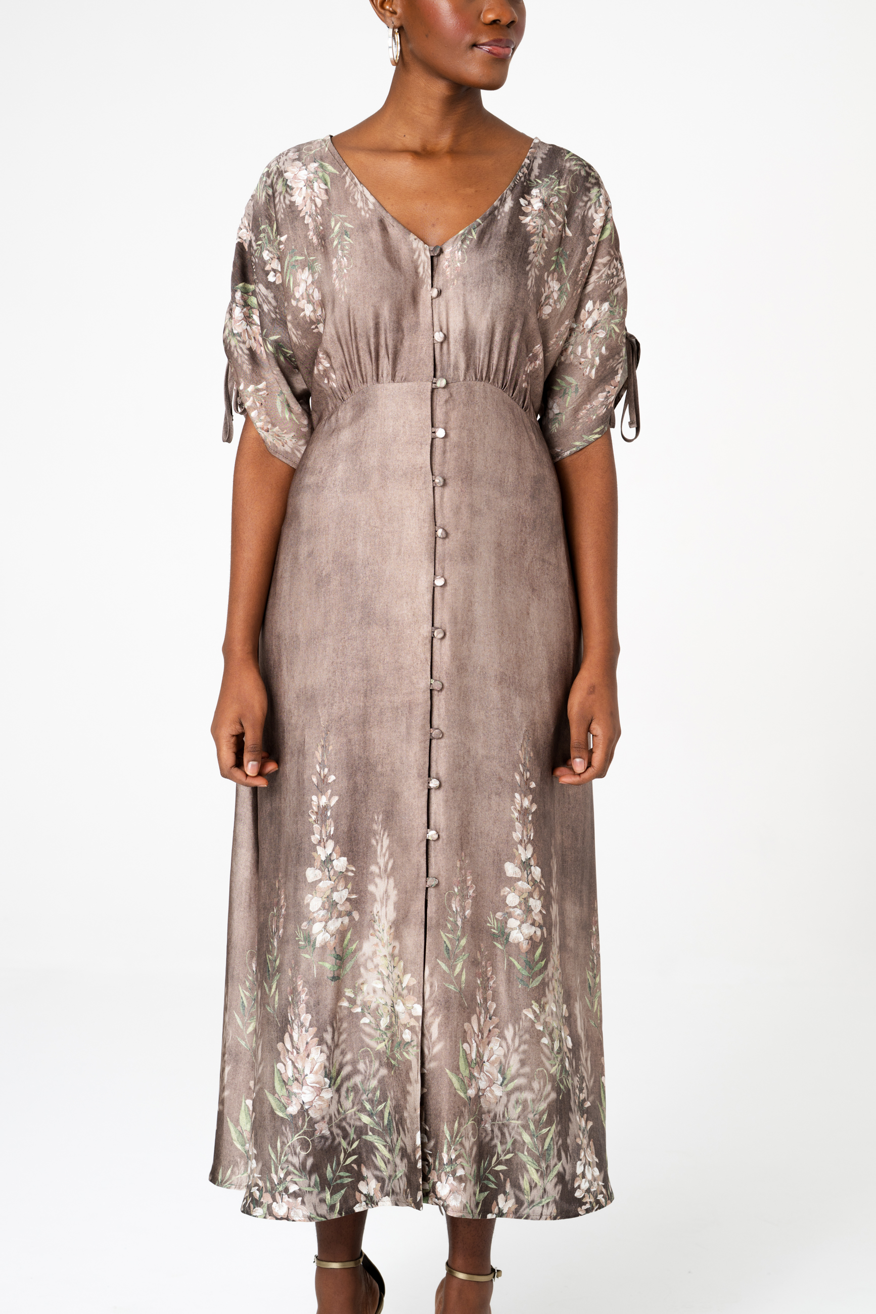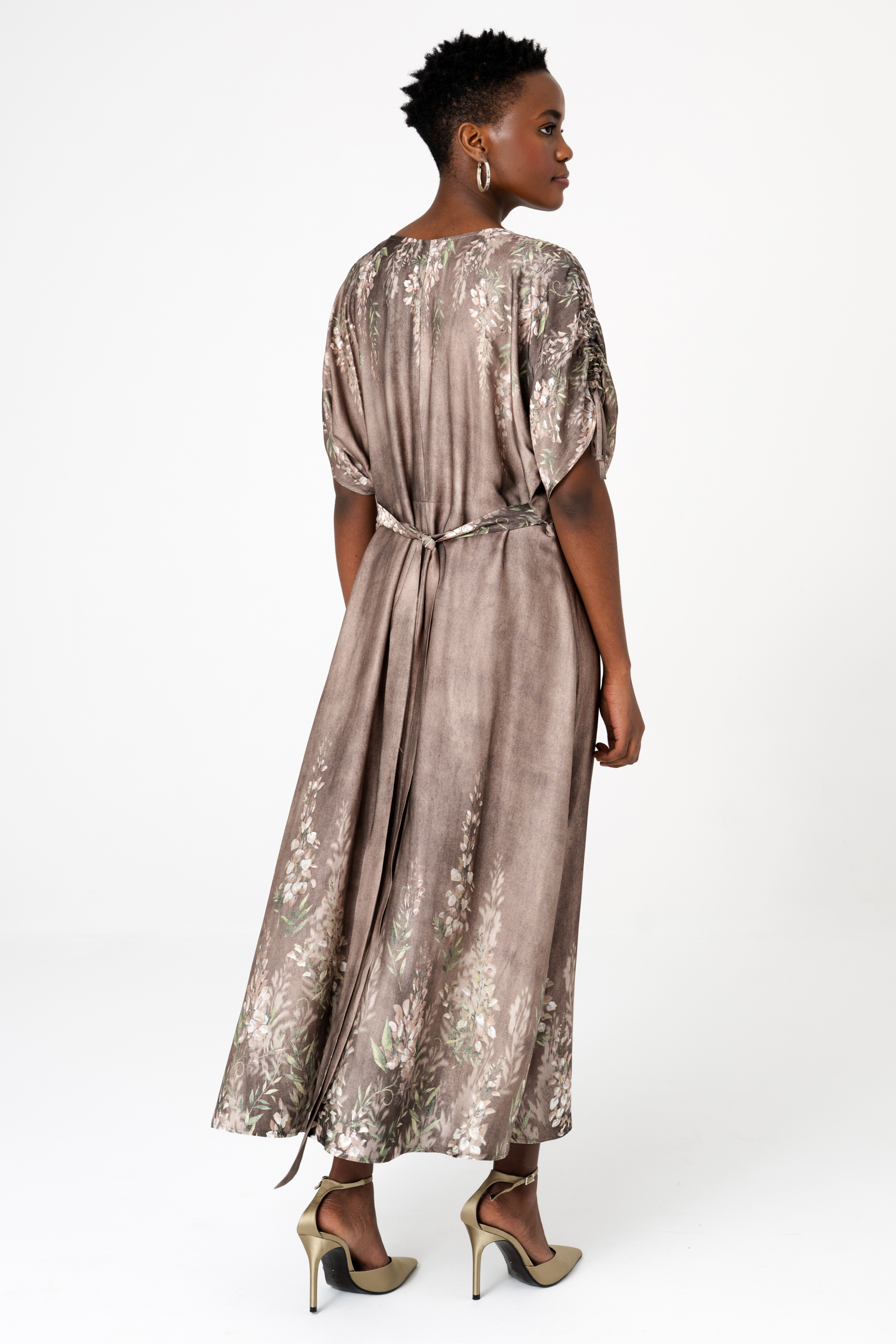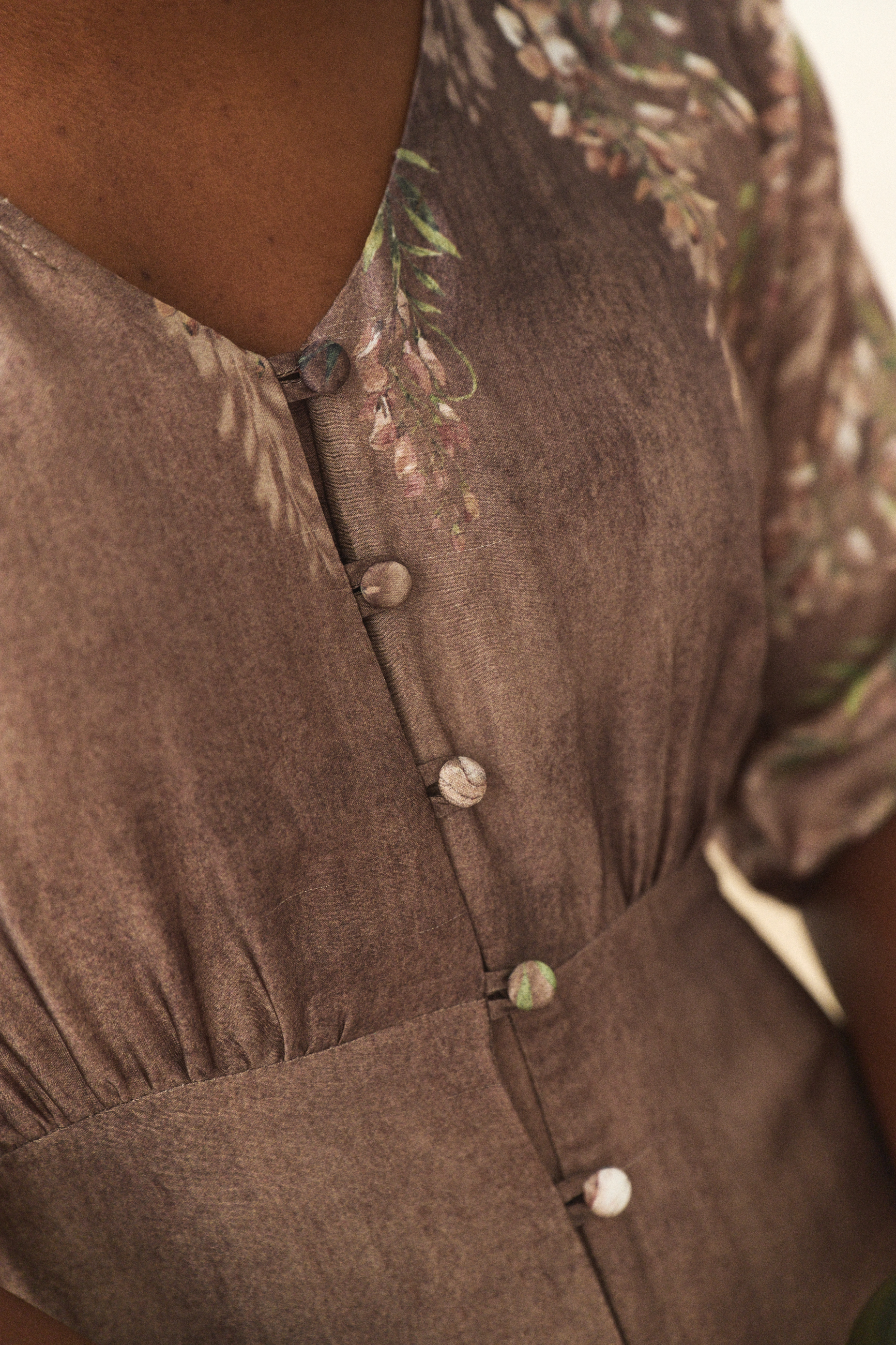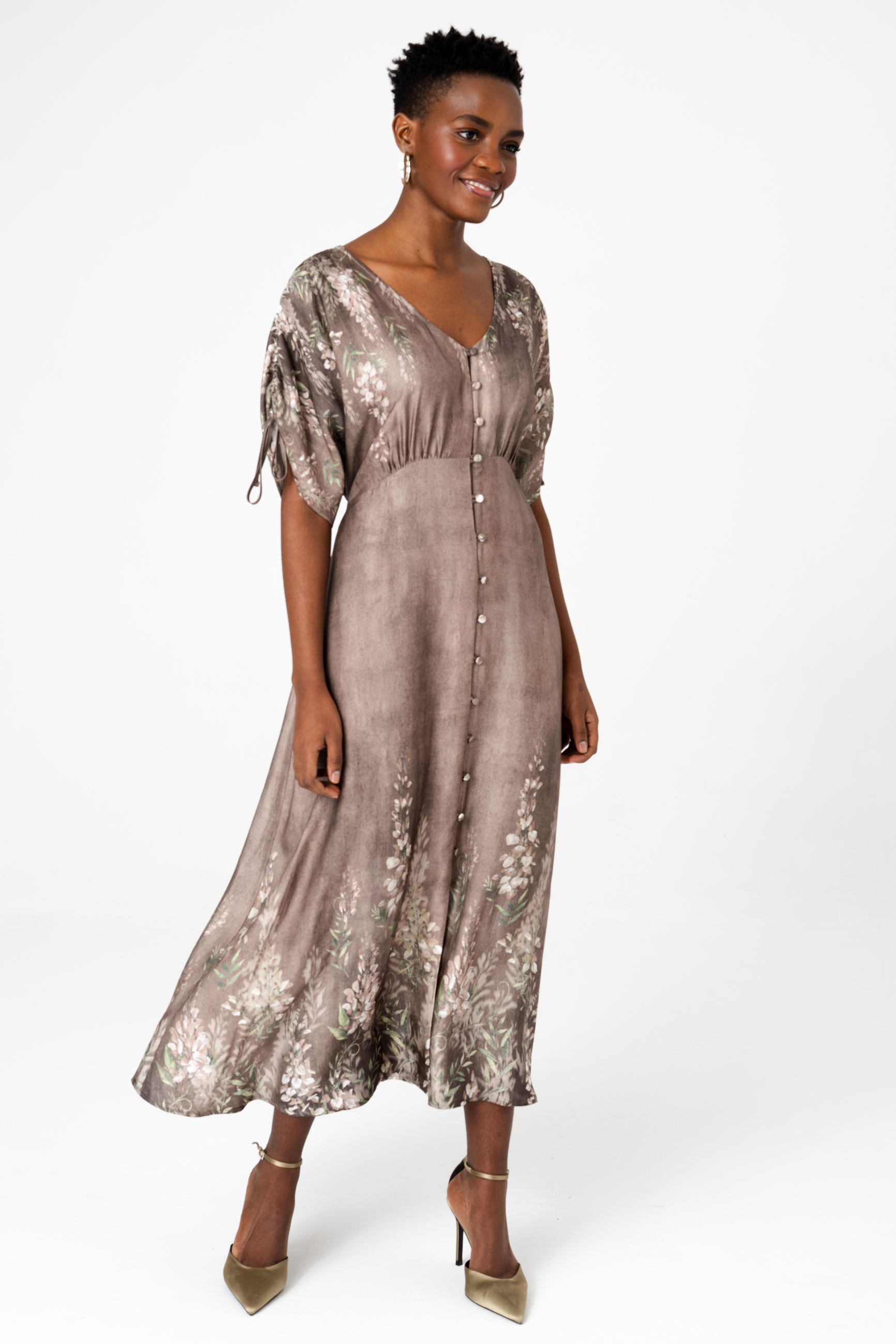 Sukienki zazwyczaj projektuje się, kroi i szyje. Ale ten model długości midi wygląda, jakby był namalowany, prawda? A to wszystko dzięki temu plastycznemu, deseniowi w kwiaty, którego nierównomierne tło przypomina impresjonistyczny obraz. Aby uzyskać taki efekt, tkanina musi być krojona ręcznie. A do wrażenia przestrzenności przyczynia się dodatkowo sama tkanina – zwiewna, powłóczysta wiskoza. Sukienka skrywa też inne artystyczne detale. Z góry do dołu zapina się na guziki z tkaniny zasadniczej. A to oznacza, że GABI może spełniać także rolę narzutki. Dla podkreślenia talii sugerujemy związać ją z tyłu. W wierzchu rękawa natomiast wszyte są ozdobne tasiemki, którymi można marszczyć rękawy. Jedyną rzeczą, na którą nie możemy się zdecydować, jest nazwa na ten oryginalny styl, łączący modę z malarstwem. Masz może jakieś propozycje?
