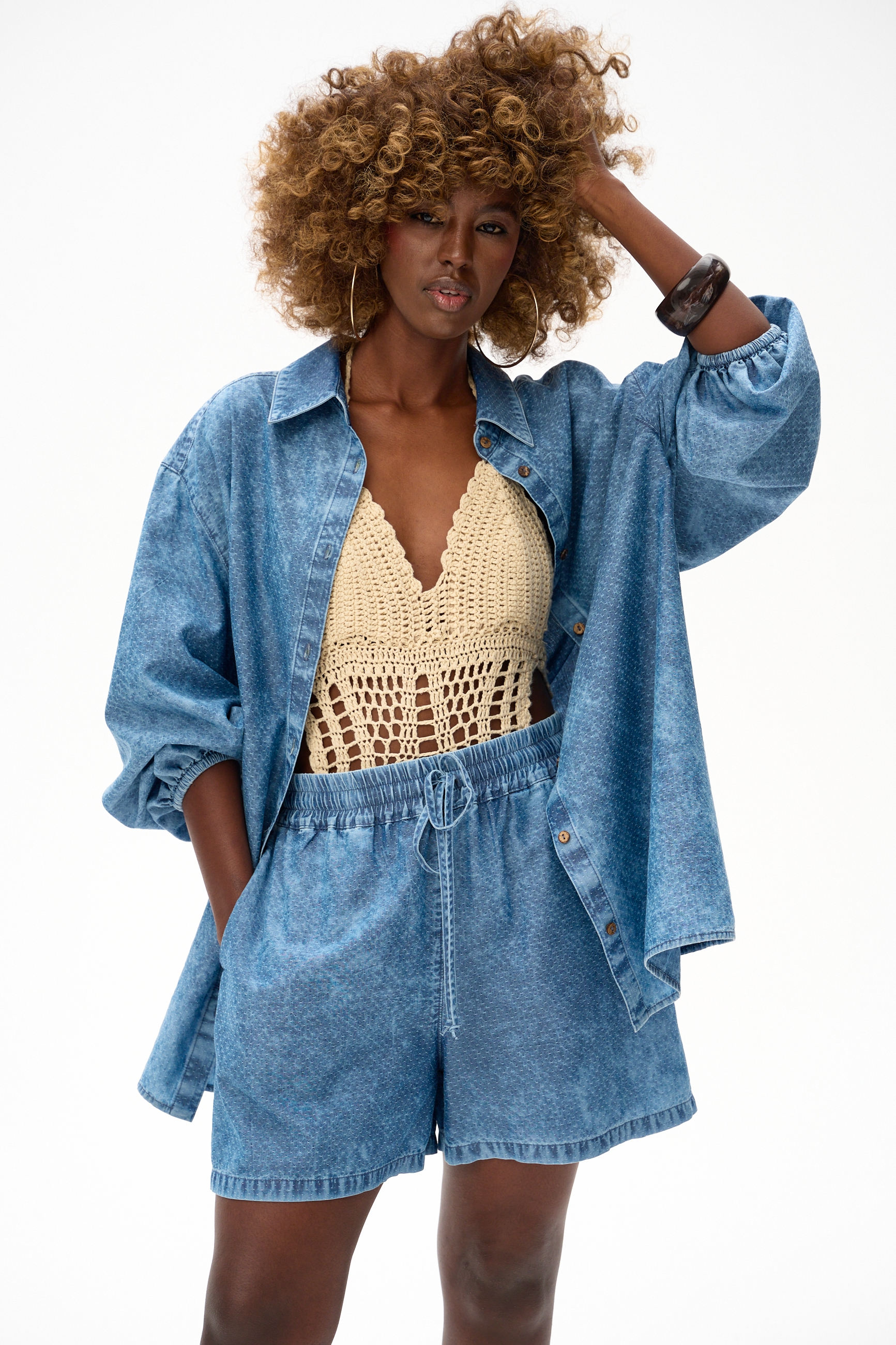 W tym modelu nie zawiniła pralka — wręcz przeciwnie. Ten zwiewny, luźny w fasonie i pięknie układający się komplet wykończyła w sposób ekologiczny, zgodny z unijnymi normami, specjalistyczna pralnia. Dzięki temu powstał ciekawy deseń z przetarciami i nierównościami w kolorze na szwach, paskach oraz plisach na każdej jego części. Sam materiał natomiast, składający się z bawełny i lyocellu, ma żakardowy wzór w postaci delikatnych nopków. Z rzeczy praktycznych dodamy, że spodnie mają kieszenie z przodu, a z tyłu w talii wygodną gumę. Koszula natomiast ma gumkę w rękawie, a zapina się na guziki kokoski. Reasumując, MATI to bardzo oryginalny charakter. Pewne rzeczy wychodzą po prostu w praniu.